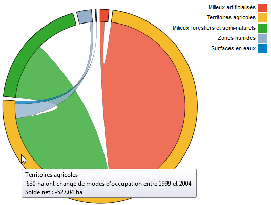 - Arrêter le curseur sur un arc de cercle, l'occupation du sol s'affiche ainsi que les superficies mutées et le solde net (gain ou perte) sur la période analysée. Sur l'exemple ci-dessous, une synthèse pour les territoires agricoles s'affichent et nous permet d'apprendre que ce poste d'occupation du sol a perdu près de 530 ha entre 1999 et 2004