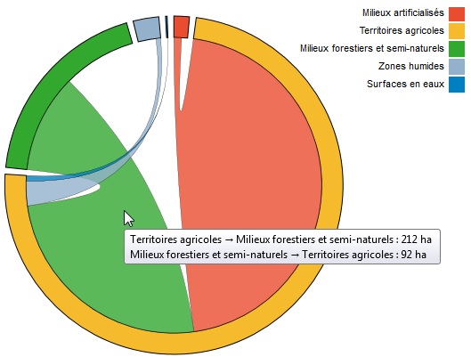 - Arrêter le curseur sur un rayon, les mutations s'affichent selon une relation "deux à deux". Sur l'exemple ci-dessous, nous distinguons les mutations entre les territoires agricoles et les surfaces forestières et milieux naturels. Nous apprenons ainsi que les milieux agricoles ont subis plus de mutations vers les milieux forestiers que l'inverse.