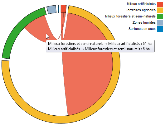 - la couleur du rayon dans le disque identique également la "destination" principale de la mutation. Sur l'exemple ci-dessous, nous constatons qu'en survolant les milieux artificialisés, les rayons sont tous de couleur rouge. Cela signifie que les surfaces mutées l'ont principalement été dans le sens : OS → milieux artificilisés.